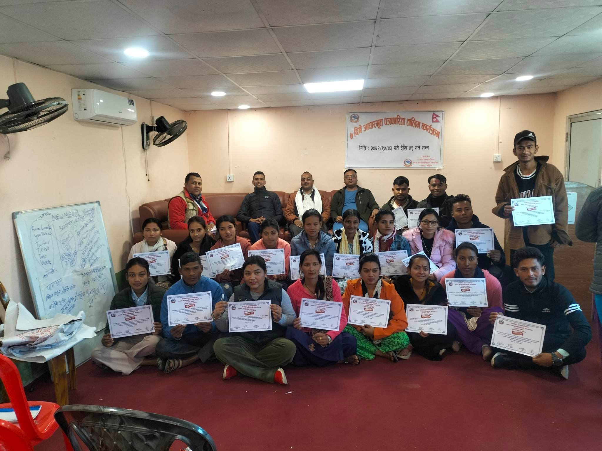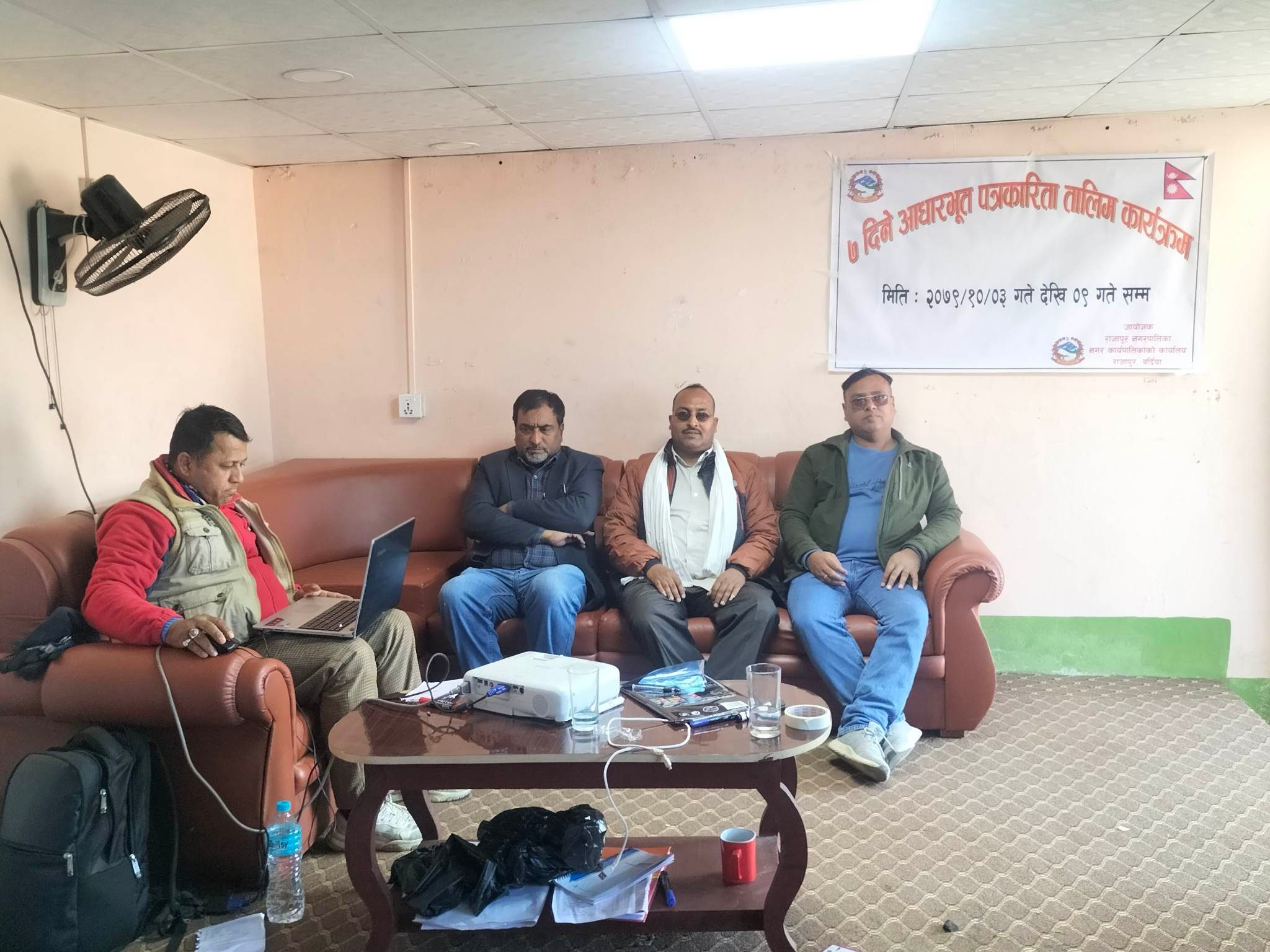आज सम्पन्न ७ दिने आधारभुत पत्रकारिता तालिमा राजापुर नगरपालिका वडा न ४ का वडा अध्यक्ष बिदुर पोखरेलकाे  अध्यक्षतामा अथिती राजापुर नगरपालिका वडा न ६ का वडा अध्यक्ष अशराज न्याैपाने ,राजापुर नगरपालिकाका प्रमुख प्रशाशकिय अधिकृत अर्जुन सुवेदी लगायतकाे उपस्थिति रहेकाे थियाे ।